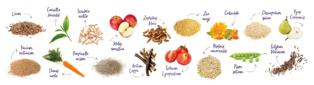 Aveia branca, cevada, farelo de trigo, cevada, milho, glúten de milho, trigo, soja extrudada, farinha de soja torrada, bolo de colza, ervilhas 4%, farinha de colza, feno de Timothy, farinha de girassol, milho extrudado, trigo extrudido, cevada extrudada, linhaça 2%, polpa de maçã 2%, sementes, plantas e flores desidratadas (tomate, pêra, cenoura, anis verde, flor de calêndula, chá verde, raiz de bardana, alpiste, painço, cardo, cardo de leite, quinoa) 2%, minhocas de farinha 1%, vermes Zophoba 1%, melaço de cana, sorgo, ácidos graxos, óleos vegetais.