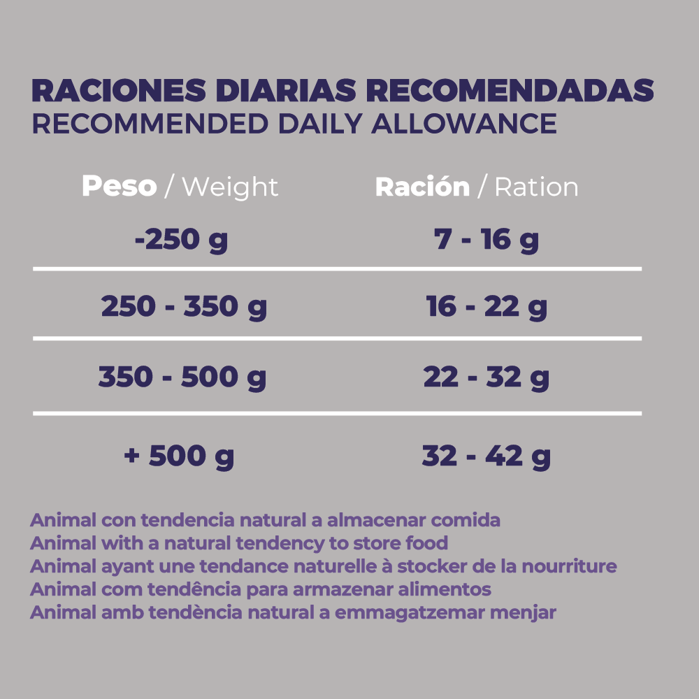 Para manter a saúde e a vitalidade do seu rato ou camundongo, é importante oferecer-lhe a quantidade certa de alimento todos os dias. As seguintes rações diárias são ajustadas de acordo com a espécie e suas necessidades, proporcionando um equilíbrio perfeito de nutrientes.