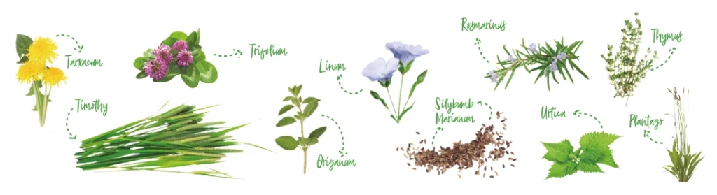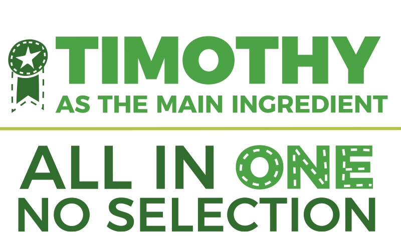 O feno de Timóteo como ingrediente principal fornece uma excelente fibra benéfica para o trânsito intestinal. Também incorpora uma grande variedade de plantas e flores selecionadas que contribuem para o fornecimento de vitaminas, oligoelementos e substâncias nutritivas necessárias.